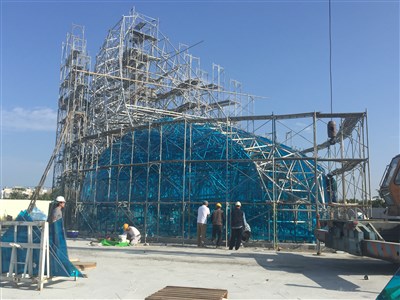 布袋高跟鞋教堂,工人今天陸續在外圍安裝藍色玻璃,看起來更漂亮。圖/黃煌權