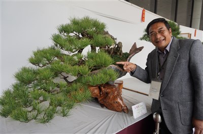 這株五葉松價值百萬,苗栗園藝世家負責人陳敏達說,五葉松不耐風吹,從種子到成熟需要20至25年,外表才會龜裂撥殼,真正脫胎換骨。圖/喻文玟
