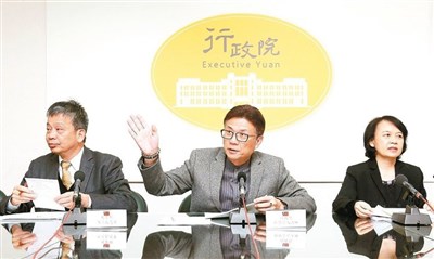 行政院發言人孫立群(中)、教育部次長陳德華(左)與勞動部主祕鍾錦季(右),上午出席記者會說明「大專院校畢業生就業薪資分析成果」。 圖/林澔一