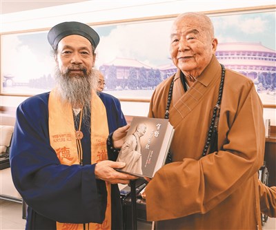 中國道教協會會長李光富(左)率團,拜訪佛光山開山星雲大師,大師致贈《貧僧有話要說》。圖/人間社記者陳碧雲