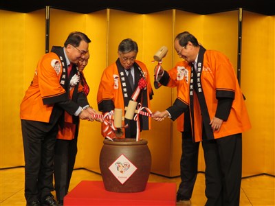 台灣美食饗宴上菜前,日本觀光局理事長松山良一(中)和我國駐日代表沈斯淳(右)觀光局長謝謂君(左)一起做日本的祈福。圖/雷光涵