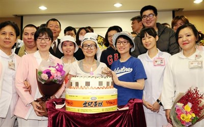三軍總醫院為八仙塵爆病患舉辦「火吻人生,情暖人心」感恩慶生會,病友與醫護人員一起切蛋糕慶祝重生,並向醫護人員表達感謝之意。圖/徐兆玄