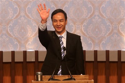 國民黨總統候選人朱立倫(圖)27日在公共電視台,出席總統候選人電視辯論會,朱立倫揮手致意。圖/中央社