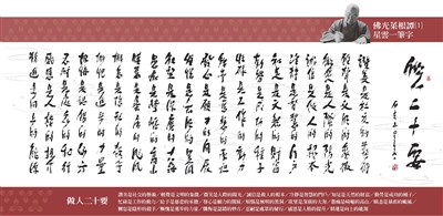 【佛光菜根譚星雲一筆字】 (1)做人二十要 星雲大師 |2016.01.01 語音朗讀 3785觀看次 字級 大 中 小 做人二十要 讚美是社交的藝術 輕聲是文明的象徵 微笑是人際的陽光 誠信是做人的根本 冷靜是智慧的門戶 知足是天然的財富 勤勞是成功的種子 忙碌是工作的動力 給予是慈悲的承擔 發心是願力的開展 煩惱是無明的黑洞 欲望是深廣的大海 愚痴是崎嶇的高山 瞋恚是暴虐的颱風 懈怠是隱形的殺手 慚愧是進步的力量 懺悔是認錯的妙方 忍耐是處眾的秘行 感恩是人格的提升 精進是向上的能源 前一篇文章 佛光菜根譚 下一篇文章 【佛光菜根譚星雲一筆字】 (2) 好人二十 熱門新聞 01動物的精采瞬間(上)2026.02.0802台北書展對話 佛光山安定動盪人心2026.02.0803點亮慈悲光明 雲林講堂觀音燈會啟燈2026.02.1204日月潭神祕黑洞2026.02.0805冬奧開幕 首創4地連線進場 2026.02.0806星雲大師全集⑳【佛教管理學③】弘法系列人事篇 人事管理法②2026.02.0807四時新啟 花海迎客2026.02.0808日本今大選 民調估自民黨眾院單獨過半2026.02.0809美擬再對台軍售 金額6千億2026.02.0810嘉年華角色選拔2026.02.08 訂閱電子報 台北市 天氣預報 台灣一週天氣預報 相關報導 【星雲一筆字古德悟道詩】(55) 【星雲一筆字古德悟道詩】(54) 【星雲一筆字古德悟道詩】(53)【星雲一筆字古德悟道詩】(52)【星雲一筆字古德悟道詩】(51) 【星雲一筆字古德悟道詩】(50) 作者其他文章星雲大師:供養的種類《星雲法語》人生四品星雲大師:四藝與人生星雲大師:如何養性星雲大師:正信之美星雲大師:養「氣」