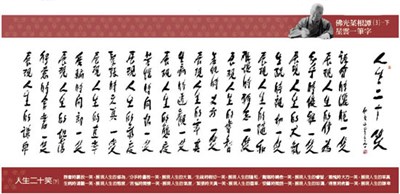 2009年以來,大師的一筆字書法已陸續巡迴佛光山各別分院、大陸、海內外博物館等展出;今應讀者要求,自2016年元旦起,預計以一年時間,每周一至周五刊登相關作品。內容包括:佛光菜根譚、古德悟道詩、佛法經偈等,都可做為人生座右銘,敬請各位期待。歡迎喜愛的讀者廣為傳播,讓大家受益。