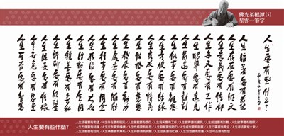【佛光菜根譚星雲大師一筆字】(5) 人生要有些什麼? 星雲大師 |2016.01.08 語音朗讀 2013觀看次 字級 大 中 小 人生要有些什麼? 人生活著要有希望 人生存在要有明天 人生意義要有信仰 人生每天要有工作 人生眼界要有遠見 人生前途要有計劃 人生做事要有觀察 人生方便要有結緣 人生交友要有情義 人生性格要有慈悲 人生發展要有動力 人生處世要有服務 人生行事要有周全 人生存活要有大眾 人生活動要有空間 人生積善要有無私 人生評斷要有明鑒 人生滋長要有忙碌 人生安危要有思量 人生可否要有智慧 前一篇文章 【佛光菜根譚星雲大師一筆字】(4) 人生二十最 下一篇文章 【佛光菜根譚星雲一筆字】 (6) 人間「就好」二十事 熱門新聞 01動物的精采瞬間(上)2026.02.0802台北書展對話 佛光山安定動盪人心2026.02.0803點亮慈悲光明 雲林講堂觀音燈會啟燈2026.02.1204日月潭神祕黑洞2026.02.0805冬奧開幕 首創4地連線進場 2026.02.0806星雲大師全集⑳【佛教管理學③】弘法系列人事篇 人事管理法②2026.02.0807日本今大選 民調估自民黨眾院單獨過半2026.02.0808美擬再對台軍售 金額6千億2026.02.0809四時新啟 花海迎客2026.02.0810嘉年華角色選拔2026.02.08 訂閱電子報 台北市 天氣預報 台灣一週天氣預報 相關報導 【星雲一筆字古德悟道詩】(55) 【星雲一筆字古德悟道詩】(54) 【星雲一筆字古德悟道詩】(53)【星雲一筆字古德悟道詩】(52)【星雲一筆字古德悟道詩】(51) 【星雲一筆字古德悟道詩】(50) 作者其他文章星雲大師:供養的種類《星雲法語》人生四品星雲大師:四藝與人生星雲大師:如何養性星雲大師:正信之美星雲大師:養「氣」