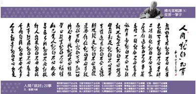 【佛光菜根譚星雲一筆字】 (6) 人間「就好」二十事 星雲大師 |2016.01.11 語音朗讀 2458觀看次 字級 大 中 小 人間「就好」20事 文/星雲大師 人間「就好」20事 萬物享有就好不必佔有 衣服可穿就好不必名牌 三餐溫飽就好不必美食 居家舒適就好不必華麗 安睡一榻就好不必寬廣 旅行平安就好不必逞強 親友安全就好不必掛念 生活知足就好不必奢華 事情過去就好不必追憶 朋友淡交就好不必過濃 夫妻信任就好不必多疑 承諾有做就好不必邀功 內心單純就好不必煩惱 舉止穩重就好不必矯情 做己貴人就好不必他求 善惡分明就好不必計較 給人接受就好不必拘泥 凡事隨緣就好不必執著 金錢夠用就好不必貪多 人生歡喜就好不必擔憂 前一篇文章 【佛光菜根譚星雲大師一筆字】(5) 人生要有些什麼? 下一篇文章 【佛光菜根譚星雲大師一筆字】 (7) 二十樂 熱門新聞 01動物的精采瞬間(上)2026.02.0802台北書展對話 佛光山安定動盪人心2026.02.0803點亮慈悲光明 雲林講堂觀音燈會啟燈2026.02.1204日月潭神祕黑洞2026.02.0805冬奧開幕 首創4地連線進場 2026.02.0806星雲大師全集⑳【佛教管理學③】弘法系列人事篇 人事管理法②2026.02.0807日本今大選 民調估自民黨眾院單獨過半2026.02.0808四時新啟 花海迎客2026.02.0809美擬再對台軍售 金額6千億2026.02.0810嘉年華角色選拔2026.02.08 訂閱電子報 台北市 天氣預報 台灣一週天氣預報 相關報導 【星雲一筆字古德悟道詩】(55) 【星雲一筆字古德悟道詩】(54) 【星雲一筆字古德悟道詩】(53)【星雲一筆字古德悟道詩】(52)【星雲一筆字古德悟道詩】(51) 【星雲一筆字古德悟道詩】(50) 作者其他文章星雲大師:供養的種類《星雲法語》人生四品星雲大師:四藝與人生星雲大師:如何養性星雲大師:正信之美星雲大師:養「氣」