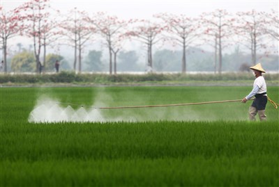 台南白河一位戴著口罩的農民在自己的稻田上用特長的竹竿噴灑農藥。圖/劉學聖