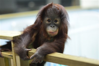【本報台北訊】北市動物園紅毛猩猩「乙森」今天歡度一歲生日,已長出12顆牙,開始學習食用固體食物,練習吃蘋果與香蕉。靈長類動物在野外要到三歲才斷奶,約一歲開始從媽媽口中找尋固體食物,以森現在除了練習咀嚼,也會食用保育員特製的水果牛奶,讓乙森先習慣各種食物的味道。