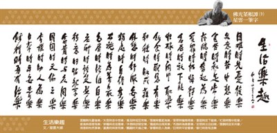 【佛光菜根譚星雲大師一筆字】(9)生活樂趣 星雲大師 |2016.01.14 語音朗讀 2049觀看次 字級 大 中 小 生活樂趣 生活樂趣 困難時先憂後樂 失意時苦中想樂 貧苦時知足常樂 落魄時奮起為樂 受罪時懺悔得樂 委屈時放下能樂 忙碌時鬧中取樂 飯食時感恩有樂 耕種時收成獲樂 休憩時舒服安樂 獨處時自得其樂 布施時為善最樂 安居時淡泊自樂 應酬時談笑共樂 得意時怡然享樂 富貴時與眾同樂 團圓時天倫之樂 掌權時助人為樂 日常時平安喜樂 修行時吾有法樂 前一篇文章 【佛光菜根譚星雲大師一筆字】(8) 世人二十苦 下一篇文章 【佛光菜根譚星雲大師一筆字】(10)心二十 熱門新聞 01動物的精采瞬間(上)2026.02.0802台北書展對話 佛光山安定動盪人心2026.02.0803日月潭神祕黑洞2026.02.0804點亮慈悲光明 雲林講堂觀音燈會啟燈2026.02.1205冬奧開幕 首創4地連線進場 2026.02.0806四時新啟 花海迎客2026.02.0807日本今大選 民調估自民黨眾院單獨過半2026.02.0808嘉年華角色選拔2026.02.0809星雲大師全集⑳【佛教管理學③】弘法系列人事篇 人事管理法②2026.02.0810美擬再對台軍售 金額6千億2026.02.08 訂閱電子報 台北市 天氣預報 台灣一週天氣預報 相關報導 【星雲一筆字古德悟道詩】(55) 【星雲一筆字古德悟道詩】(54) 【星雲一筆字古德悟道詩】(53)【星雲一筆字古德悟道詩】(52)【星雲一筆字古德悟道詩】(51) 【星雲一筆字古德悟道詩】(50) 作者其他文章星雲大師:供養的種類《星雲法語》人生四品星雲大師:四藝與人生星雲大師:如何養性星雲大師:正信之美星雲大師:養「氣」
