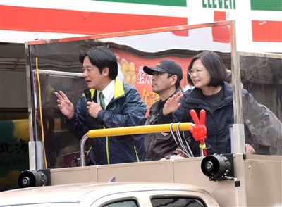大選倒數計時,民進黨總統候選人蔡英文(右)14日在台南展開選前最後一場車隊遊行,受到熱烈歡迎。左為台南市長賴清德。圖/中央社