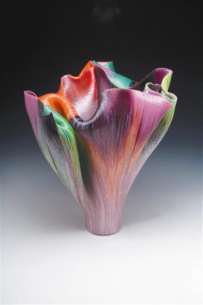 此次「Why Glass?」展覽,由詹斯基授權展出十件作品,絢麗、燦爛,將玻璃的輕盈與色彩發揮到極致。她獨門的「filet-de-verre」熱熔玻璃絲技術。將彩色的玻璃棒,拉成上千根玻璃髮絲。經過多次熱熔與塑型,完成充滿生命感的作品。
