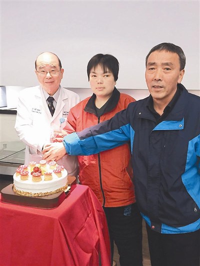 徐珊珊(中)結束來台半年多的治療,許文憲主任醫師(左)與徐爸爸一同切蛋糕,開心慶祝。圖/萬芳醫院提供