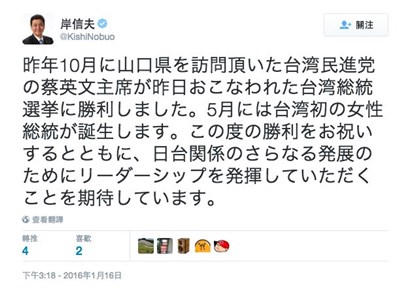 日本眾議員岸信夫在推特祝福蔡英文當選台灣總統。圖/雷光涵 |2016.01.17 語音朗讀 880觀看次 字級 大 中 小 日本眾議員岸信夫在推特祝福蔡英文當選台灣總統。圖/雷光涵 【本報綜合報導】日本眾議員、現任首相安倍晉三的胞弟岸信夫今天在推特及臉書說,去年訪問他選區山口縣的台灣民進黨主席蔡英文昨天贏得台灣總統選舉,今年5年台灣將誕生首位女總統。在恭賀蔡的勝選外,也期待蔡英文發揮領導力深化台日關係發展。岸信夫也是「日華議員懇談會」的重要幹部。 前一篇文章 德外交部長 肯定台大選民主價值 下一篇文章 雲門舞集 展開美國7城巡演 熱門新聞 01佛光山印度沙彌剃度 願復興印度佛教2025.11.2502【遊藝筆記】 寒潭欲下遲2025.11.2503【生活快門】小裝飾大創意2025.11.2504【遇見荷】雨滴的吟唱2025.11.2505睡前滑手機熬夜追劇 糖尿病風險飆增67%2025.11.2506中巴佛光康寧醫院 慶祝建院22周年2025.11.2507TPASS 2.0+ 長途客運北高最低42折2025.11.2508初冬銀杏正美2025.11.2509俄烏和平架構 美烏協商更新 2025.11.2510宿霧聖卡洛大學、佛光山 暢談翻譯與真理2025.11.25 訂閱電子報 台北市 天氣預報 台灣一週天氣預報 相關報導 【星雲大師如是說】處事禪心【星雲大師如是說】人間佛教【星雲大師如是說】正信之美【星雲大師如是說】輪轉相繼【星雲大師如是說】有情的層次【星雲大師如是說】六忍歌