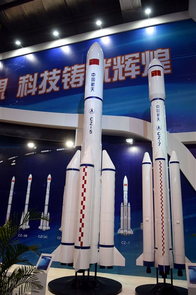 2014年11月的第10屆中國國際航空航天博覽會上,大陸曾經展出長征五號(左,代號CZ-5)、長征七號(右,代號CZ-7)。圖/中央社