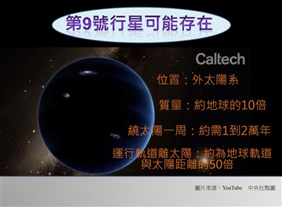 美國加州理工學院(California Institute of Technology)20日宣布,1顆先前未知的巨大行星可能存在外太陽系,暱稱為「第9行星」(Planet Nine)。製圖/中央社