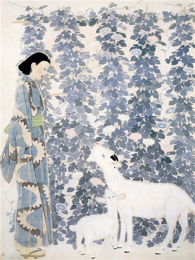 國美館展出的典藏品之一《朝涼》為林之助早期代表作,一九四○年完成,描寫作者於清涼早晨出遊的印象。朝霧迷濛中所見牽牛花、畫中左側人物,身著深藍色和服的未婚妻、猶如作者本人化身的白羊,描述兩人相戀又相隔兩地的相思寫照,既深情又溫馨可愛。