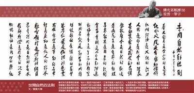 【佛光菜根譚星雲大師一筆字】(12)世間自然的法則 |2016.01.22 語音朗讀 1950觀看次 字級 大 中 小 世間自然的法則 文/星雲大師 春花秋月是季節的美景/地水火風是宇宙的條件/江湖河海是大地的活力/人我是非是社會的現象/喜怒哀樂是感受的表情/ 悲歡離合是自然的狀況/老病死生是生命的循環/善惡報應是因果的法則/貧富貴賤是人生的際遇/福祿壽喜是生存的願望/ 功成名就是勤奮的成績/瞋恨嫉妒是情緒的惡習/忠孝仁愛是倫理的要素/成住壞空是事物的無常/禮義廉恥是做人的根本/ 悲智願行是修行的綱目/忍辱持戒是自我的要求/信解行證是行者的次第/慚愧懺悔是內心的淨化 前一篇文章 【佛光菜根譚星雲大師一筆字】(11)-4 第四天─四天之四 下一篇文章 【佛光菜根譚星雲大師一筆字】(13) 知苦增福歌(上) 熱門新聞 01動物的精采瞬間(上)2026.02.0802台北書展 佛光山拉近佛與讀者距離 看得懂用得著 佛教徒必讀經典重磅獻禮2026.02.0703斯里蘭卡獨立節 佛光人至駐菲大使館同賀2026.02.0704健康瘦身, 遠離糖尿病!2026.02.0705台北書展對話 佛光山安定動盪人心2026.02.0806台北書展 佛光山拉近佛與讀者距離 文心雕佛問世 楊渡、許悔之、廖玉蕙遇見佛 2026.02.0707星雲大師全集⑳【佛教管理學③】弘法系列人事篇 人事管理法①2026.02.0708後備軍人教召 改為14天2026.02.0709福山寺送暖 福田戶投鉢植福2026.02.0710點亮慈悲光明 雲林講堂觀音燈會啟燈2026.02.12 訂閱電子報 台北市 天氣預報 台灣一週天氣預報 相關報導 【星雲一筆字古德悟道詩】(55) 【星雲一筆字古德悟道詩】(54) 【星雲一筆字古德悟道詩】(53)【星雲一筆字古德悟道詩】(52)【星雲一筆字古德悟道詩】(51) 【星雲一筆字古德悟道詩】(50)