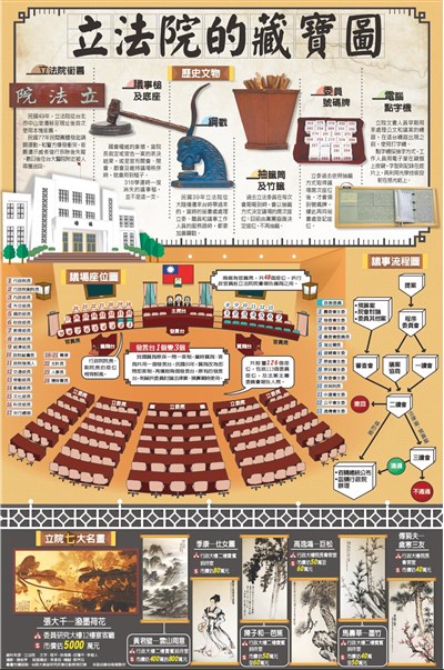 聽到立法院,許多人除了想到立委和法案,或許第一印象還有立委在會議間的咆哮或肢體衝突。其實立法院除了是立委們工作的場所,從歷史文物到院內收藏品都有豐富可看的內涵和故事,收藏品五花八門,還有價值數千萬的張大千的畫作;另外,立法院的議場座位與會議流程,都值得好好認識。