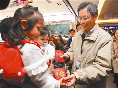 昨天是農曆春節前最後一個上班日,行政院長張善政(右)特別前往視察桃園國際機場春節疏運各項準備工作,視察時也親切送給小朋友猴年小紅包。圖/鄭超文