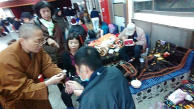 佛光山南台別院住持妙勤法師帶領佛光會員至收容中心,關心災民。