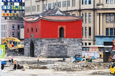 【本報台北訊】台北市進行忠孝橋引道拆除,工程進度超前,北門周邊的橋體已拆除完畢,圍在古蹟北門外的「金鐘罩鐵布衫」,昨天進行卸除工作,讓被忠孝橋引道遮掩三十九個年頭的這座城門,再度以全貌亮相。