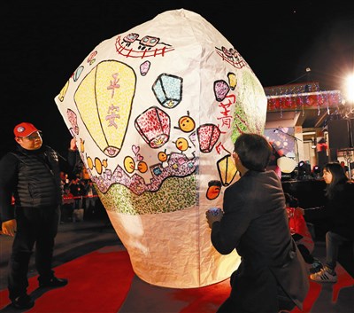 新北副市長侯友宜在天燈上寫下「猴來運轉、福庇台南」。他說,台南的地震災難仍在搶救,北台灣也感同身受,「台灣人民是團結一心的,我們要為台南加油集氣」。平平安安看似簡單,但如今已成多少人微小的心願,侯友宜最後願大家「有一個平安的夜晚」。