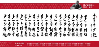 【佛光菜根譚星雲大師一筆字】星雲大師(20)十多十少歌 星雲大師 |2016.02.12 語音朗讀 2840觀看次 字級 大 中 小 十多十少歌 文/星雲大師 多一分理性,少一分情緒 多一分公義,少一分特權 多一分服務,少一分自私 多一分寬厚,少一分刻薄 多一分誠信,少一分虛假 多一分讚美,少一分惡口 多一分精進,少一分懈怠 多一分慈悲,少一分瞋恚 多一分喜捨,少一分慳吝 多一分禪心,少一分掛礙 前一篇文章 【佛光菜根譚星雲大師一筆字】(19)十好加十好 下一篇文章 【佛光菜根譚星雲大師一筆字】(21)提醒自我 上 熱門新聞 01動物的精采瞬間(上)2026.02.0802【遨遊藝事】巴黎 黛瑪兄弟茶館(Dammann Frères)2026.02.060310年前震倒115死 台南維冠改建防震7級大樓2026.02.0604台北書展 佛光山拉近佛與讀者距離 看得懂用得著 佛教徒必讀經典重磅獻禮2026.02.0705斯里蘭卡獨立節 佛光人至駐菲大使館同賀2026.02.0706台北書展 佛光山拉近佛與讀者距離 文心雕佛問世 楊渡、許悔之、廖玉蕙遇見佛 2026.02.0707法拉第籠2026.02.0608王德瑾 願做有溫度的藝術家2026.02.0709健康瘦身, 遠離糖尿病!2026.02.0710NFL 第60屆超級盃 愛國者、海鷹爭霸2026.02.06 訂閱電子報 台北市 天氣預報 台灣一週天氣預報 相關報導 【星雲一筆字古德悟道詩】(55) 【星雲一筆字古德悟道詩】(54) 【星雲一筆字古德悟道詩】(53)【星雲一筆字古德悟道詩】(52)【星雲一筆字古德悟道詩】(51) 【星雲一筆字古德悟道詩】(50) 作者其他文章星雲大師:供養的種類《星雲法語》人生四品星雲大師:四藝與人生星雲大師:如何養性星雲大師:正信之美星雲大師:養「氣」