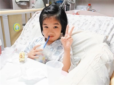 在維冠大樓受困六十一小時,八歲小妹妹林素琴終於喝到她喜歡的思樂冰。圖/奇美醫院提供