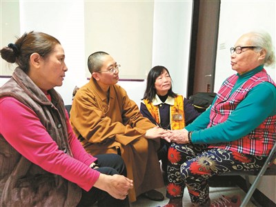 佛光山南台別院住持妙勤法師(中)與佛光人,探望住在南台別院的黃桂妹(左一)與老婆婆黃林花娥(右一),為兩人加油打氣。
