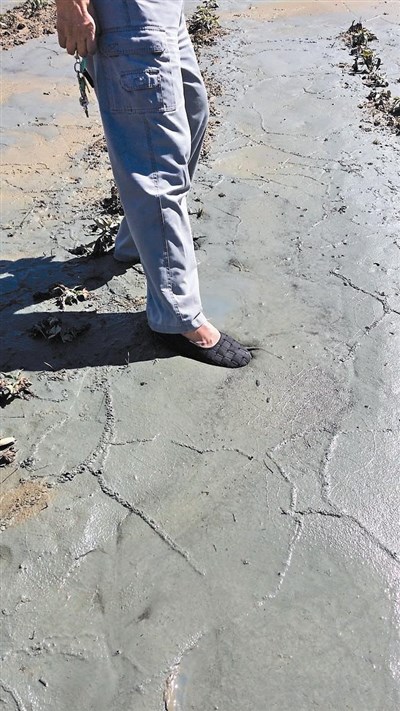 地震中倒塌的維冠大樓附近農地,地震之後原本黃色的土壤被黑色的泥流所覆蓋,原本堅硬的地面也變成像流沙一般。圖/修瑞瑩