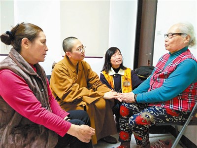 佛光山南台別院住持妙勤法師(中)與佛光人,探望住在南台別院的黃桂妹(左一)與老婆婆黃林花娥(右一),為兩人加油打氣。