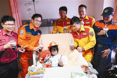 【本報台南訊】「思樂冰叔叔」實現承諾!高雄市特搜中隊員施心章與六名救難英雄,昨天帶著思樂冰到奇美醫院探視林素琴小妹妹。林素琴一看見救她的叔叔,開心又害羞地說「謝謝你們救我出來」。
