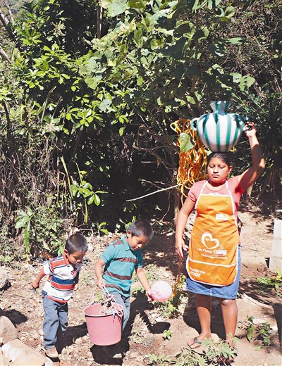 瑪麗亞帶二名兒子取井水,重達十公斤的水桶就頂在頭上。
