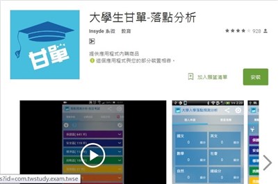 考生也可到Google Play或App Store下載「巨微雲集」公司研發的「大學生甘單—落點分析」App,輸入學測成績,可依錄取機率列出保證區、安全區、標準區、挑戰區、危險區、渺茫區、淘汰區等7個區域的校系志願。