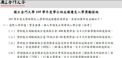 李錫捷說,金大為爭取滿分生就讀,開出8學期共400萬元獎學金,前年1名台中一中學生報到;金大也已和成大、清大、台師大等本島頂尖大學交換學生,目前讀資工系大二的該名滿分生就已到成大交換2年,接受更豐富多元的訓練。