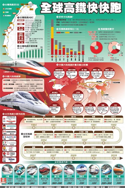 資料、圖片來源:維基百科、中國大陸高鐵網、美國高鐵協會(USHSR)、世界鐵路組織(UIC)、台灣高鐵 文字:陳澄和、陳世欽、范振光、顏文廷 版面構成:林鎮西、韓光耀 ■本版由聯合晚報製作