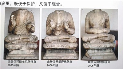 河北幽居寺釋迦牟尼佛(左)佛首回歸,但無量壽佛(中)和阿閦佛的佛首仍下落不明。