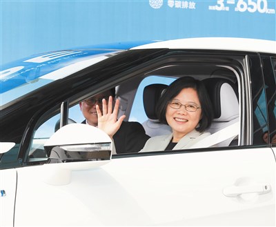 蔡英文致詞後試乘現場展示的日系氫能汽車,她握住方向盤、啟動引擎,雖然車子沒動,但她仍繫上安全帶,並仔細聆聽解說。