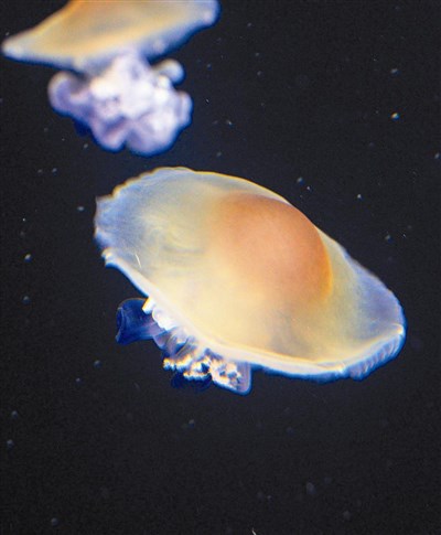 【本報屏東訊】「太神奇了! 牠們的長相超像顆剛煎熟的荷包蛋,還能在水中以輕柔優雅的姿勢蠕動前進。」屏東海生館最近引進荷包蛋水母,牠們的泳鐘在進食後呈現橘黃色,有如飽滿的蛋黃,周邊傘衣則是白色,初登場就讓遊客驚呼連連,成為吸睛嬌客。