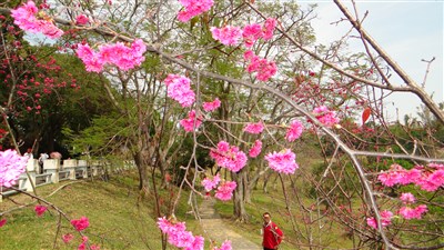 【本報台南訊】春暖花開,烏山頭水庫櫻花公園種植的數百株八重櫻、河津櫻近日綻放,接近滿開盛況。花況遠勝於春節期間,預計賞花期可延續到下周,水庫人員提醒遊客可把握最後機會,否則錯過又要等到明年了。