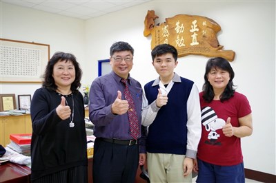 國立嘉義高商楊善壹(右2)錄取台大人類學系,是嘉商自創校以來,第一次應屆生錄取台大,校長郭義騰(左2)感到與有榮焉。圖/中央社