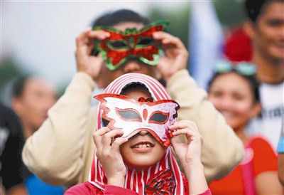 印尼巨港的民眾,戴特製觀測鏡觀看日全食。