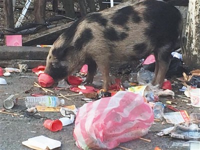豬隻在垃圾堆裡翻咬找東西吃,垃圾袋都被咬破,垃圾散落一地。