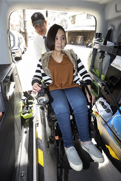身障者叫到無障礙計程車,必須靠司機推上車、固定輪椅、繫安全帶。吳姓司機說,加入無障礙計程車隊約兩年,當時因政府有購車補助,加上有些使命感,認為是未來趨勢,決定花145萬元買車。但多數司機考量收入問題,加入意願不高,也有無障礙計程車司機較喜歡接旅遊包車,比接送身障者的收入較穩定。