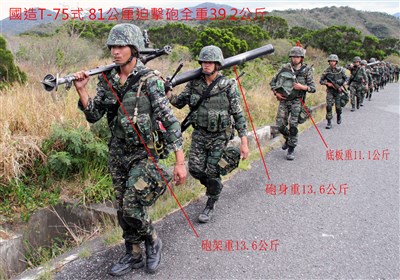 國防部位於屏東恆春的三軍聯訓基地,海軍陸戰隊員接受訓練,除了隨身步槍等制式裝備外,81公厘迫擊砲組須將全重超過40公斤的組件與標竿,分由3名士兵或扛或抱,在極為艱難的行走條件下,一日行軍20公里到40公里,被士兵視為最艱苦的行軍任務。