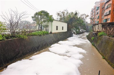 【本報新竹訊】新竹縣新豐鄉中崙村民昨天凌晨發現,橫貫村內的中崙溪支流,不少河段出現大量泡沫,幾乎達一層樓高,且積久不散,村民昨通報環保局,新竹縣環保局到場發現,檢測水體酸鹼值在正常範圍,但汙染嚴重,懷疑是上游一處工廠傾倒清潔劑,將向上追查,若查明也將依水汙染防治法開罰。