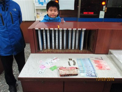 台中崇光國小五年級學生魏國仲拾獲近5萬元現金,到霧峰警分局內新派出所報案。圖/警方提供