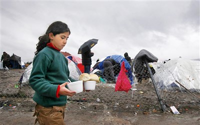 聯合國難民事務高級專員公署表示,今年已有十三萬多名移民和難民經地中海抵歐洲,大多是逃離戰火的敘利亞難民。圖為敘利亞難民來到馬其頓與塞爾維亞邊界,珍惜手中的麵包和熱湯。圖/美聯社