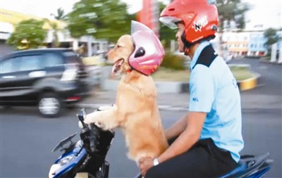 【本報綜合外電報導】印尼網路近來瘋傳一支短片。影片中一隻黃金獵犬戴著安全帽,駕駛一輛摩托車,載著主人兜風(圖/取自網路)。許多網友都大讚這隻黃金獵犬「藝高狗膽大」。